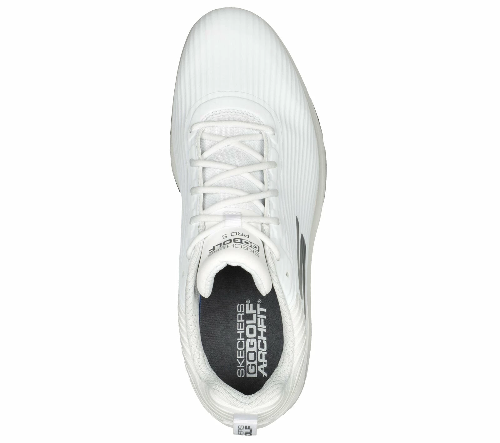 Improve your game with dynamic comfort and style wearing Skechers GO GOLF Pro 5 Hyper. This lace-up golf design features a waterproof synthetic upper, a removable Arch Fit comfort insole with high-performance Resamax cushioning, ultra lightweight HYPER BURST cushioned midsole and replaceable Softspikes.